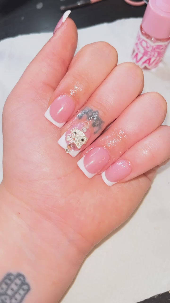 - The French tip design adds a touch of elegance to your nails while the heart-shaped gems and Hello Kitty charm add a playful and fun element